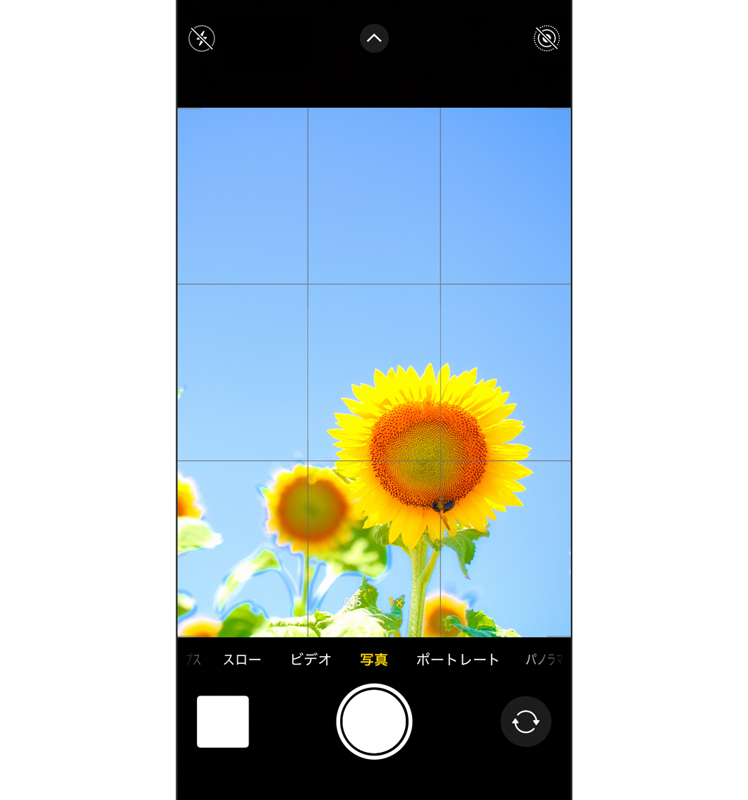 これで、カメラを開いた際に画面上に縦横3本ずつの線が表示され、画面が9分割されます。この線が構図を整えるための基準になります。